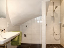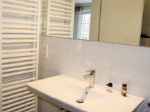 Das schicke Badezimmer verfügt über eine Dusche, ein WC und ein großes Waschbecken mit riesigem Spiegel. Zur Ausstattung gehört auch ein Waschtrockner und ein großer Heizkörper für Ihre Badehandtücher. Der Fußboden verfügt über eine wohlige Fußbodenerwärmung.