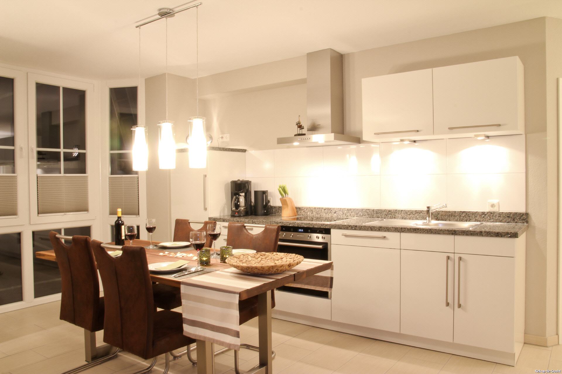 Im Essbereich finden Sie eine edle Hochglanzküche mit Elektroherd, Backofen, Mikrowelle, Kühl- und Gefrierschrank, Geschirrspülmaschine, Kaffeemaschine, Wasserkocher, Toaster etc. Auf der Granitarbeitsplatte macht das Kochen Spaß, denn beim Zubereiten der Mahlzeiten schauen Sie den vorbeifahrenden Booten zu. Am großen Esstisch aus Echtholzbaumscheiben läßt es sich natürlich und erdverbunden speisen.